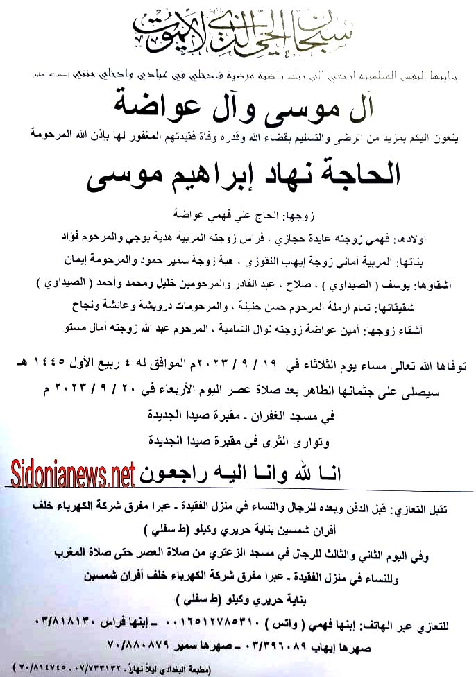 الحاجة نهاد ابراهيم موسى 20-9-2023 آل موسى وعواضه وحجازي وبوجي والنقوزي وحمود والصيداوي وحنينه والشاميه ومستو (وفيات صيدا –لبنان – صيدونيانيوز.نت)
