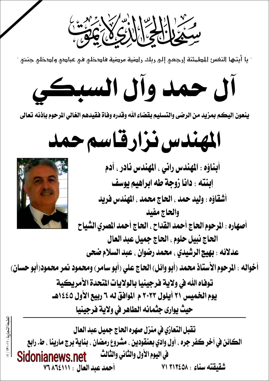 المهندس نزار قاسم حمد توفاه الله في فرجينيا بأميركا 21-9-2023 آل حمد والسبكي ويوسف والقداح والمصري الشياح وحلوم وعبد العال والرشيدي ورضوان وضحى (وفيات صيدا – لبنان – صيدونيانيوز.نت)