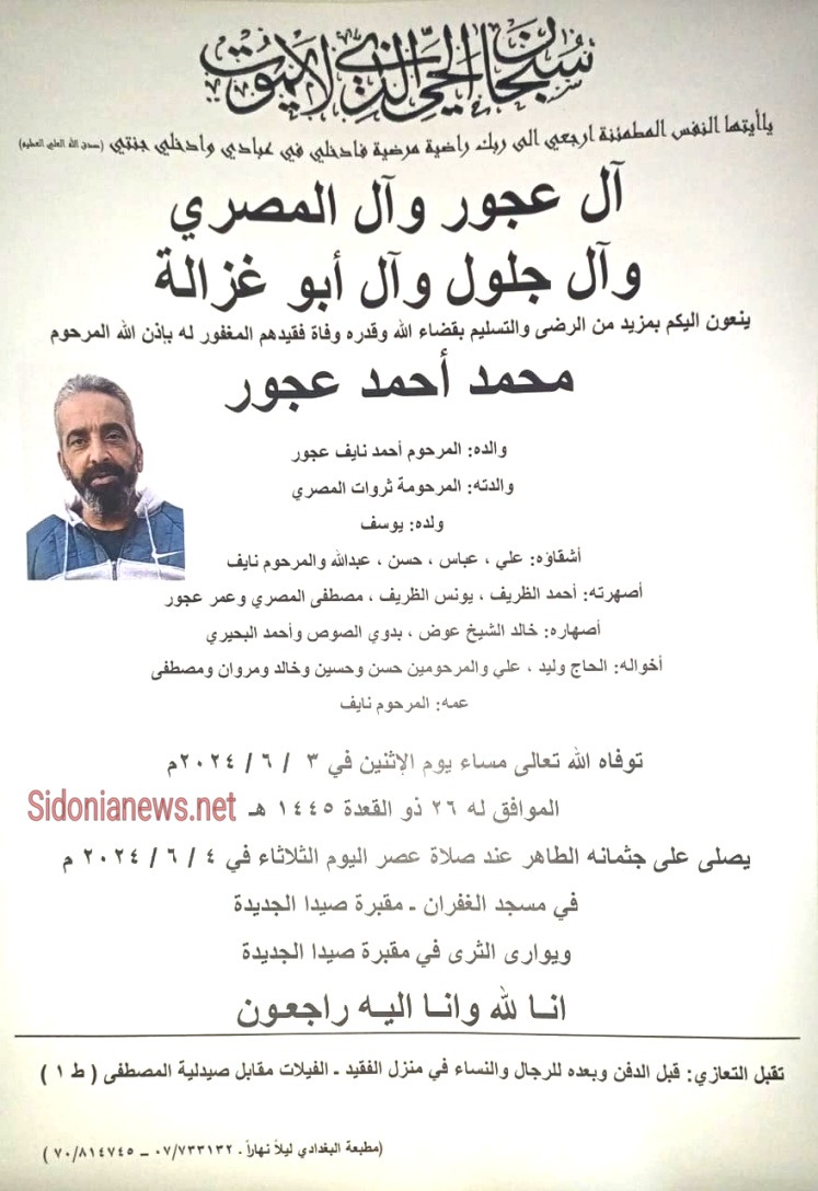 جريدة صيدونيانيوز.نت / وفاة محمد أحمد عجور ٤-٦-٢٠٢٤ آل عجور والمصري وجلول وأبو غزالة (وفيات صيدا لبنان جريدة صيدونيانيوز.نت ) 2024-06-04 Sidonianews.net ------- وفاة محمد أحمد عجور ٤-٦-٢٠٢٤ آل عجور والمصري وجلول وأبو غزالة (وفيات صيدا لبنان جريدة صيدونيانيوز.نت ) 2024-06-04