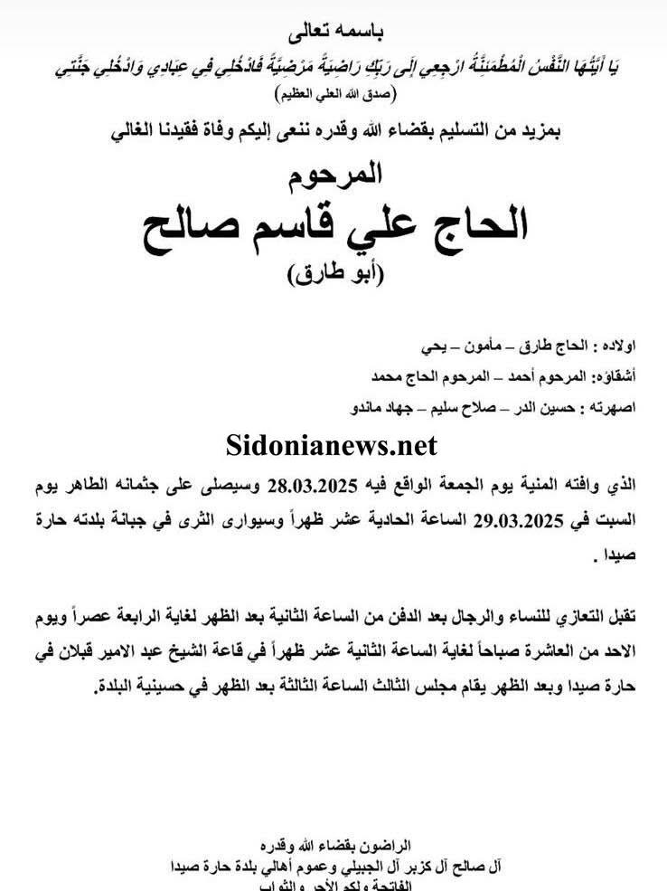 وفاة الحاج علي قاسم صالح - الدفن 29-3-2025 زوج عمة الأستاذ كامل كزبر - آل صالح وكزبر والجبيلي (وفيات صيدا لبنان - جريدة صيدونيانيوز.نت )