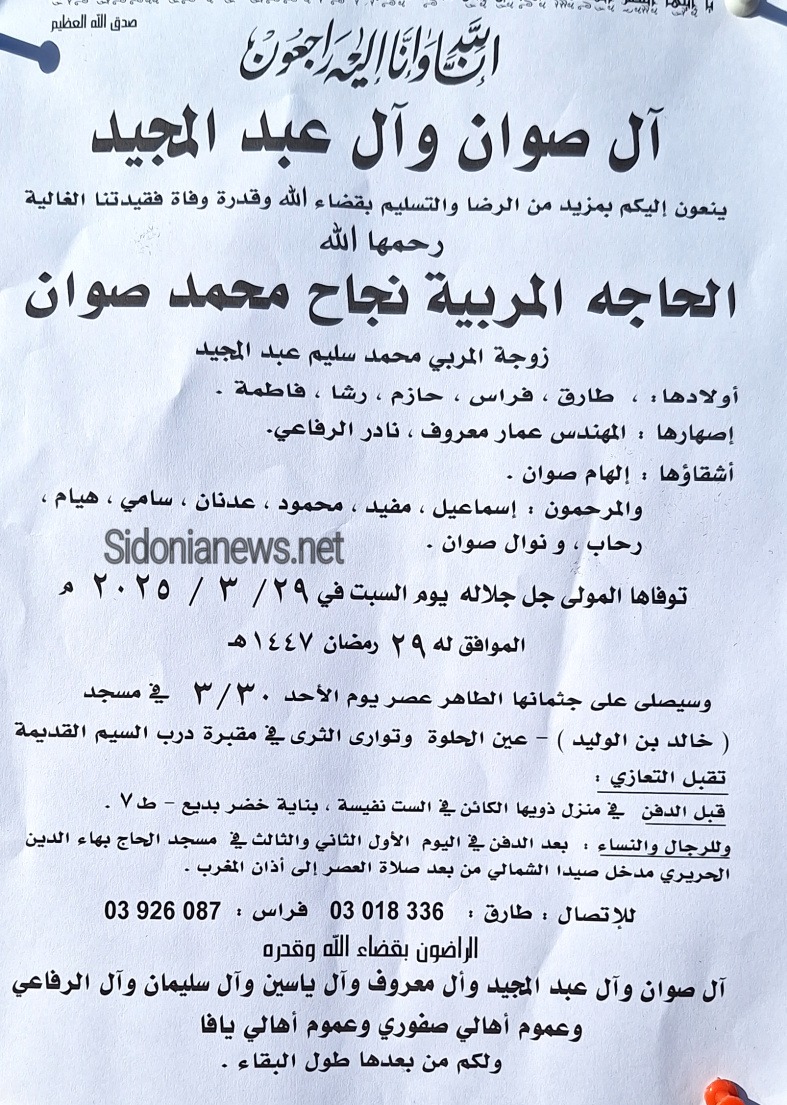 وفاة الحاجة المربية نجاح محمد صوان 30-3-2025 آل صوان وعبدالمجيد ومعروف وياسين وسليمان والرفاعي (وفيات صيدا - صفوري ويافا - لبنان وفلسطين - جريدة صيدونيانيوز.نت)