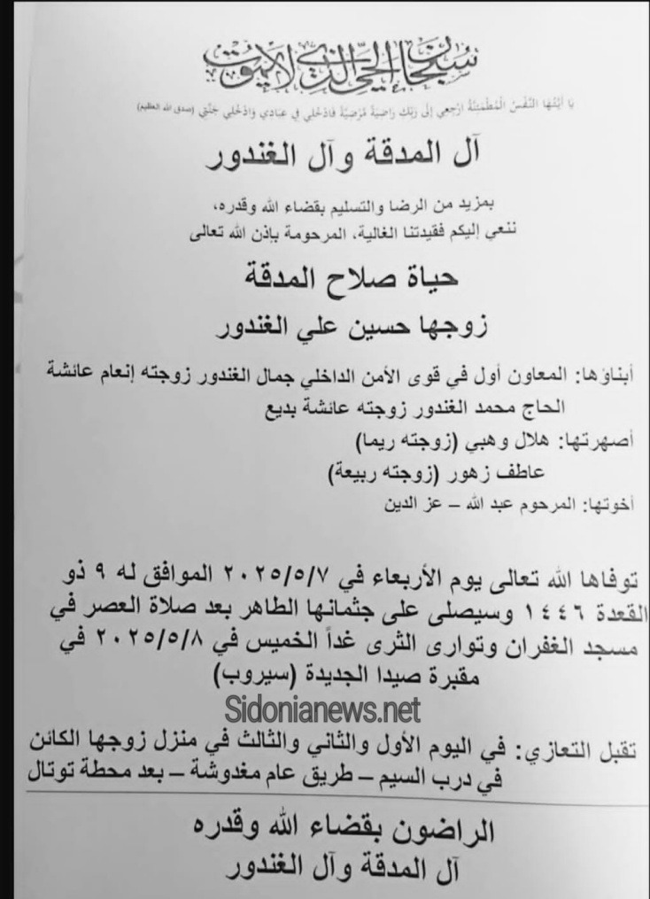 جريدة صيدونيانيوز.نت / وفاة حياة صلاح المدقه 8-5-2025 آل المدقه والغندور وبديع ووهبي (وفيات صيدا – لبنان – صيدونيانيوز.نت) 2025-05-08 Sidonianews.net ------------------- وفاة حياة صلاح المدقه 8-5-2025 آل المدقه والغندور وبديع ووهبي (وفيات صيدا – لبنان – صيدونيانيوز.نت) 2025-05-08