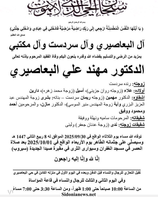 وفاة الدكتور مهند علي البعاصيري 1-10-2025 آل البعاصيري وسردست ومكتبي وجزيني وزهرة والبزري والسوسي وجعفر (وفيات صيدا لبنان - جريدة صيدونيانيوز.نت)