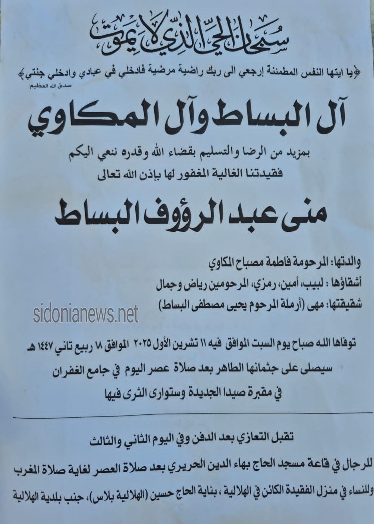 جريدة صيدونيانيوز.نت / وفاة منى عبدالرؤوف البساط- ١١-١٠-٢٠٢٥ آل البساط والمكاوي 2025-10-10 2025-10-10