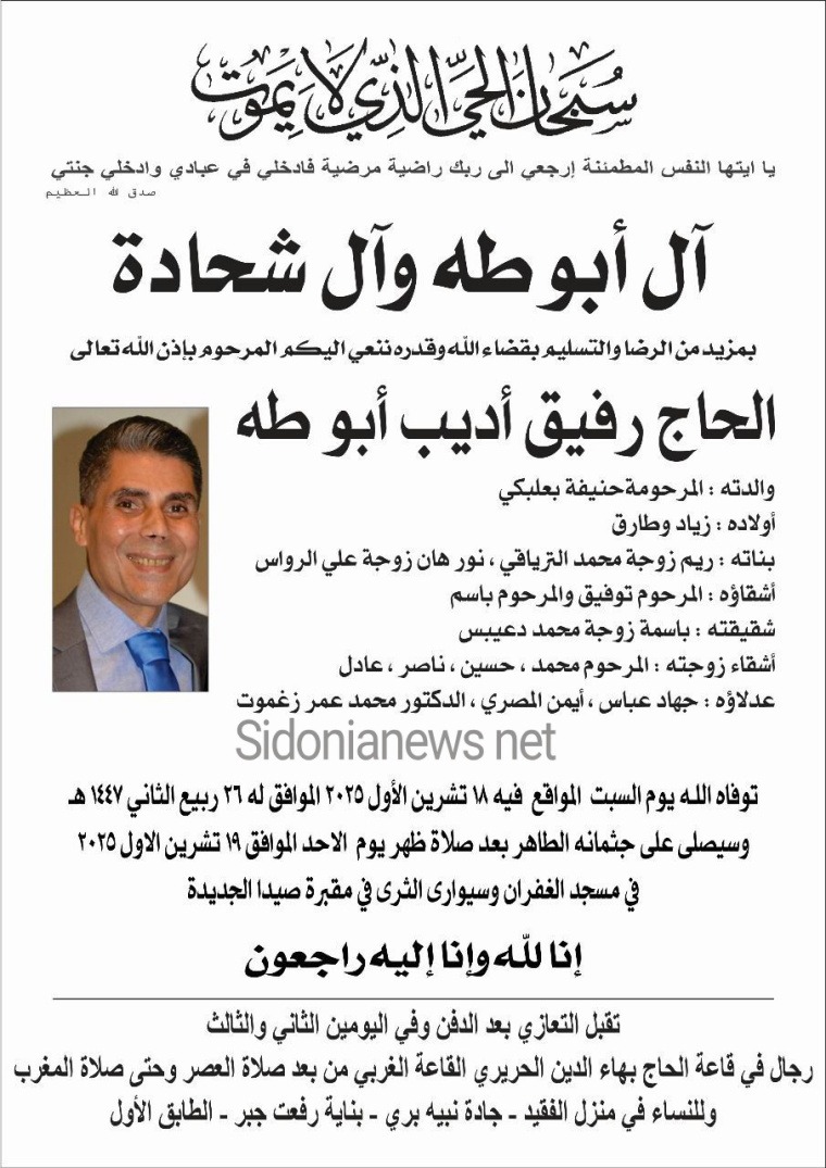جريدة صيدونيانيوز.نت / وفاة الحاج رفيق أديب أبوطه -19-10-2025 آل أبوطه شحاده (وفيات صيدا لبنان - جريدة صيدونيانيوز.نت) 2025-10-18 Sidonianews.net ---------- وفاة الحاج رفيق أديب أبوطه -19-10-2025 آل أبوطه شحاده (وفيات صيدا لبنان - جريدة صيدونيانيوز.نت) 2025-10-18