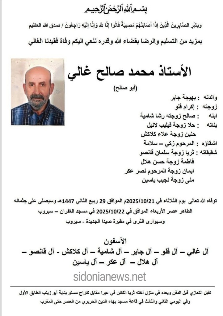 جريدة صيدونيانيوز.نت / وفاة الاستاذ محمد صالح غالي -٢٢-١٠-٢٠٢٥ -الدفن اليوم في صيدا -آل غالي وفلو وجابر وشامية وكلاكش وقانصو وهلال وعكر وياسين (وفيات صيدا لبنان جريدة صيدونيانيوز.نت)