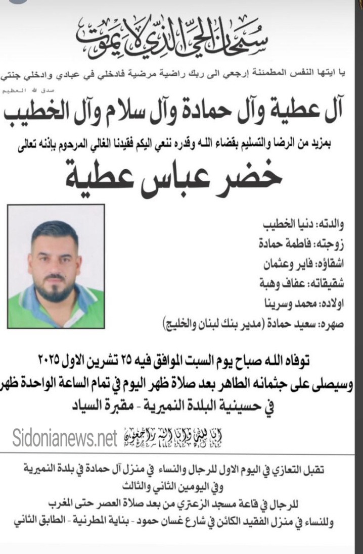 وفاة الشاب خضر عباس عطيه -25-10-2025-التعازي في صيدا يومي الأحد والاثنين آل عطيه وحمادة وسلام والخطيب (وفيات النميرية - صيدا - لبنان - صيدونيانيوز.نت)
