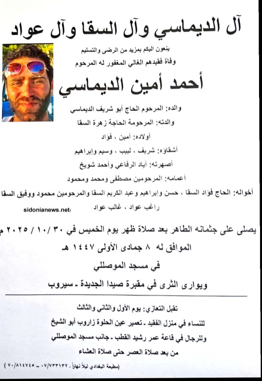وفاة الشاب أحمد أمين الديماسي 30-10-2025 آل الديماسي والسقا والرفاعي وشويخ (وفيات صيدا – لبنان – صيدونيانيوز.نت)