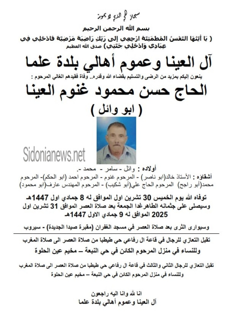 وفاة الحاج حسن محمود غنوم العينا -31-10-2025 آل العينا (وفيات صيدا - عين الحلوة لبنان - فلسطين - جريدة صيدونيانيوز.نت)