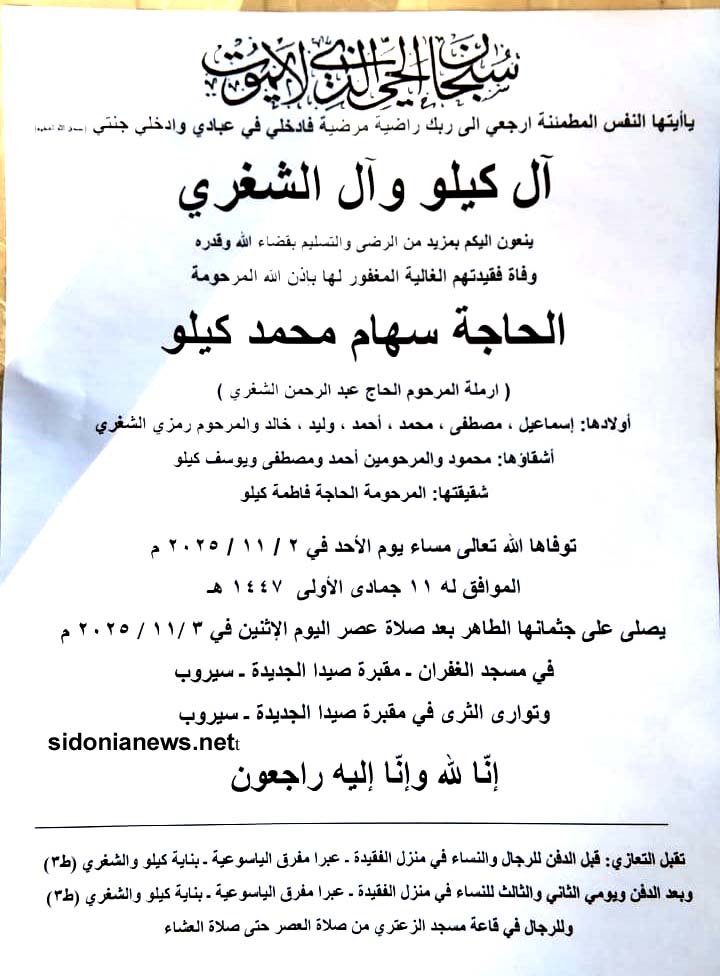 جريدة صيدونيانيوز.نت / وفاة الحاجة سهام محمد كيلو 3-11-2025 آل كيلو والشغري (وفيات صيدا – لبنان – جريدة صيدونيانيوز.نت) 2025-11-03 Sidonianews.net ---------------------- وفاة الحاجة سهام محمد كيلو 3-11-2025 آل كيلو والشغري (وفيات صيدا – لبنان – جريدة صيدونيانيوز.نت) 2025-11-03