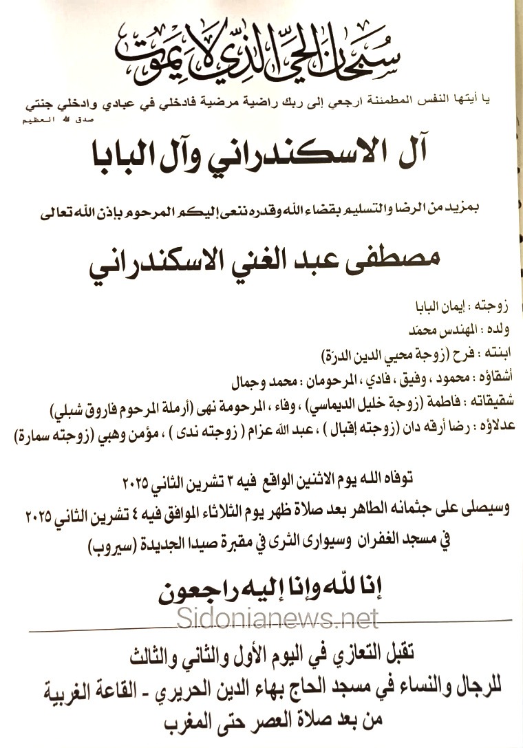 وفاة مصطفى عبدالغني الإسكندراني - 4-11-2025 آل الإسكندراني والبابا والدرة والديماسي وشبلي وأرقه دان وعزام ووهبي(وفيات صيدا لبنان - جريدة صيدونيانيوز.نت)