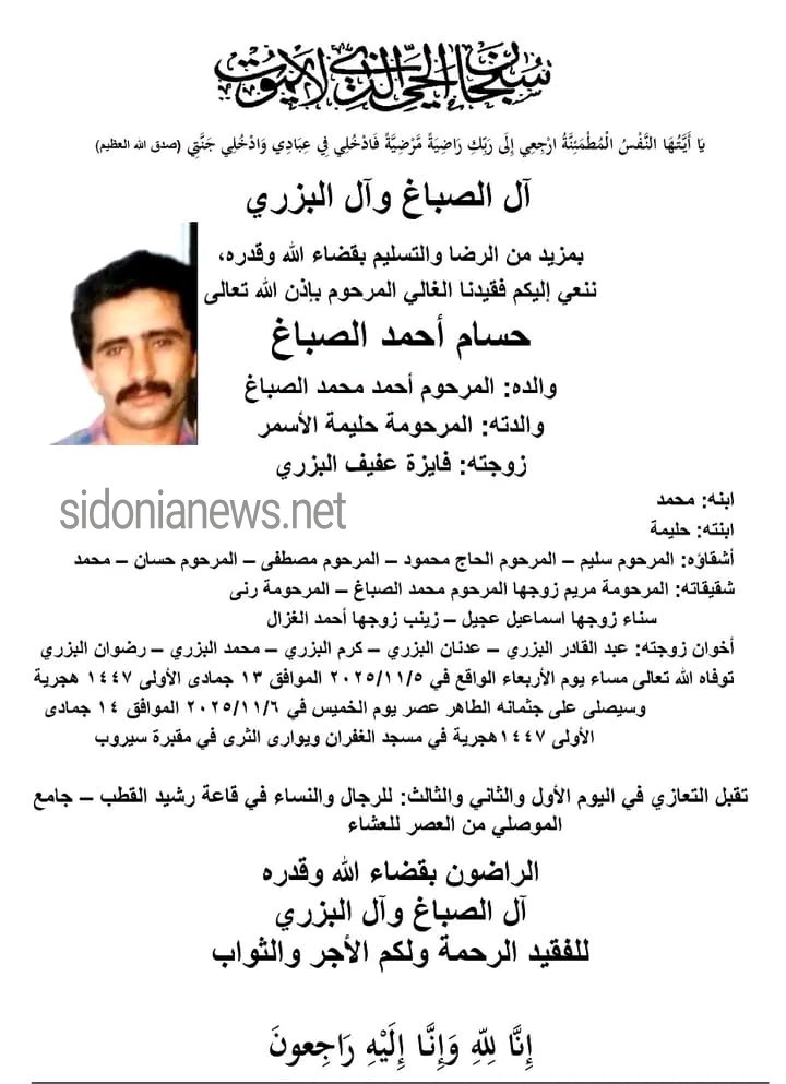 جريدة صيدونيانيوز.نت / وفاة حسام أحمد الصباغ -6-11-2025 آل الصباغ والبزري والأسمر وعجيل والغزال (وفيات صيدا لبنان - جريدة صيدونيانيوز.نت) 2025-11-06 Sidonianews.net -------- وفاة حسام أحمد الصباغ -6-11-2025 آل الصباغ والبزري والأسمر وعجيل والغزال (وفيات صيدا لبنان - جريدة صيدونيانيوز.نت) 2025-11-06