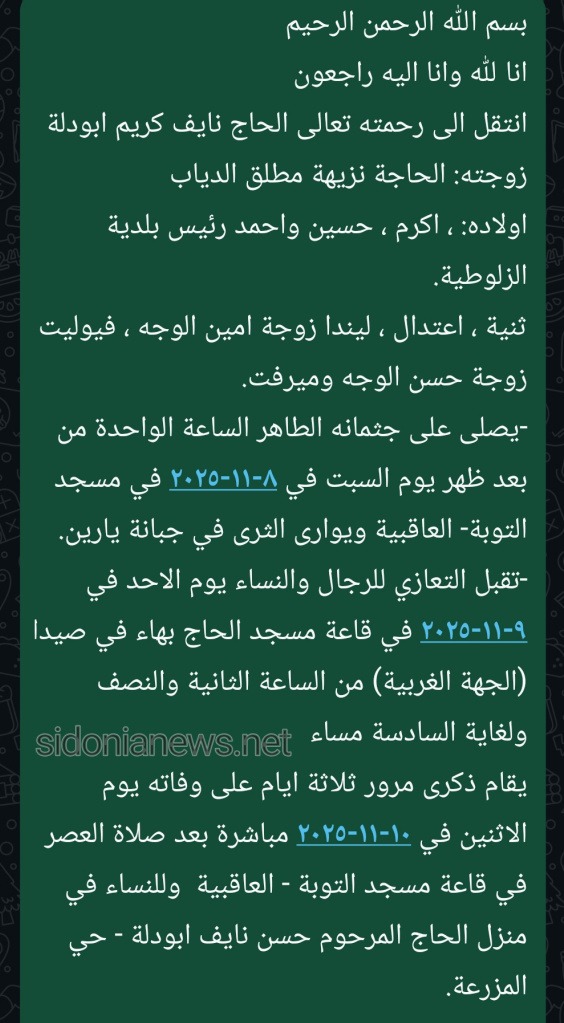 وفاة الحاج نايف كريم أبودلة - التعازي في صيدا 9-11-2025 - آل أبودلة ودياب ( وفيات صيدا - العاقبية - لبنان - جريدة صيدونيانيوز.نت)