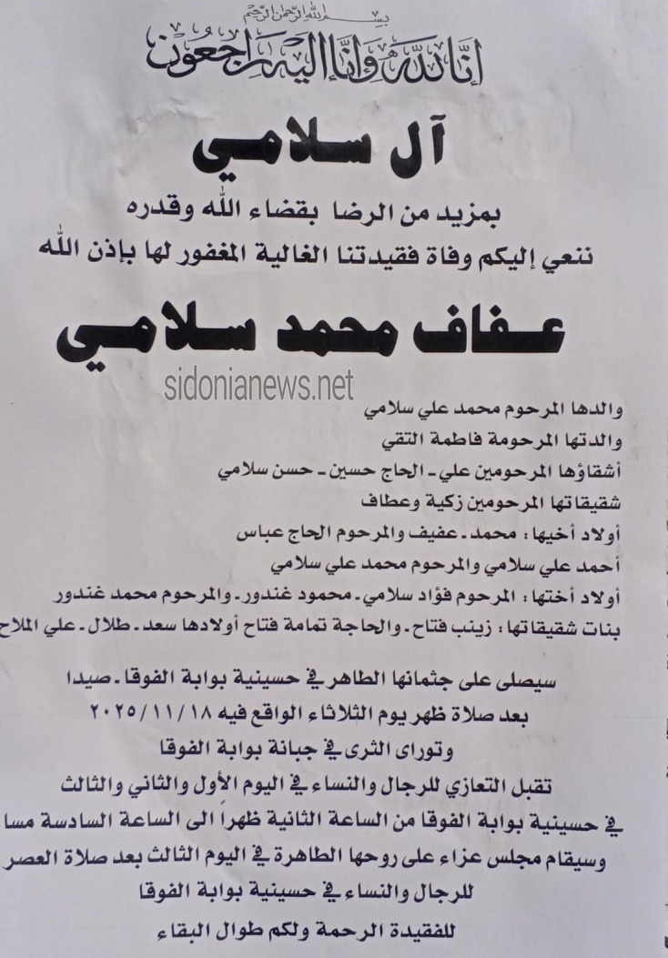 جريدة صيدونيانيوز.نت / وفاة عفاف محمد سلامي 18-11-2025 آل سلامي والتقي وغندور والملاح (وفيات صيدا – لبنان – جريدة صيدونيانيوز.نت) 2025-11-18 Sidonianews.net ---------------------- وفاة عفاف محمد سلامي 18-11-2025 آل سلامي والتقي وغندور والملاح (وفيات صيدا – لبنان – جريدة صيدونيانيوز.نت) 2025-11-18