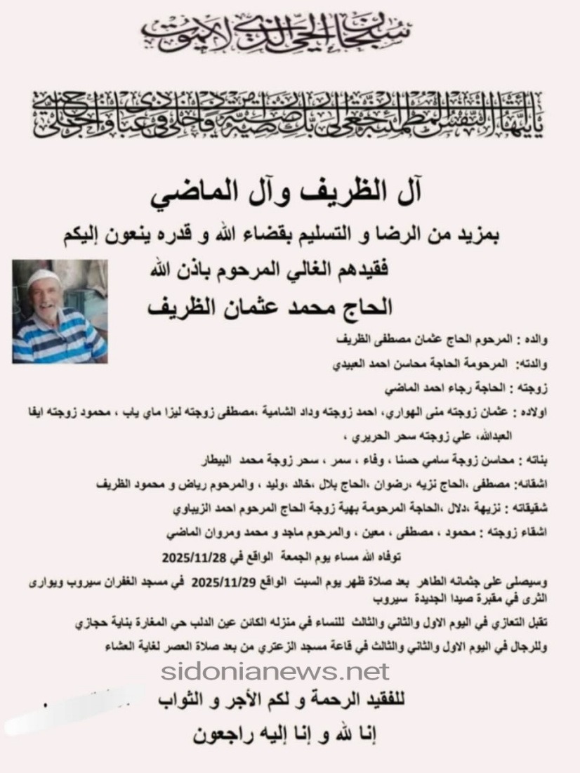 وفاة الحاج محمد عثمان الظريف - 28-11-2025 آل الظريف والماضي والعبيدي والهواري والشامية وماي باب والعبدالله والحريري وحسنا والبيطار والزيباوي (وفيات صيدا لبنان - جريدة صيدونيانيوز.نت)