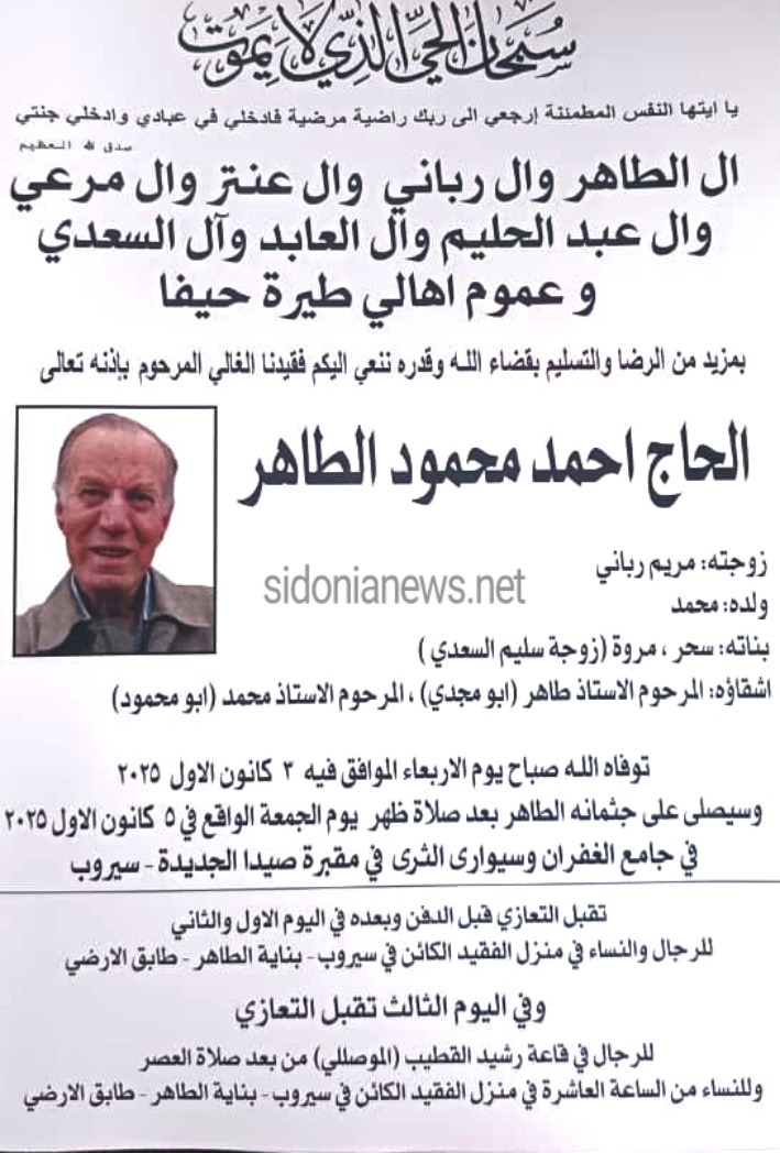 وفاة الحاج أحمد محمود الطاهر الدفن -5-12-2025- آل الطاهر ورباني وعنتر ومرعي وعبدالحليم والعابد والسعدي (وفيات صيدا - لبنان - طيرة حرفا - فلسطين - جريدة صيدونيانيوز.نت)-