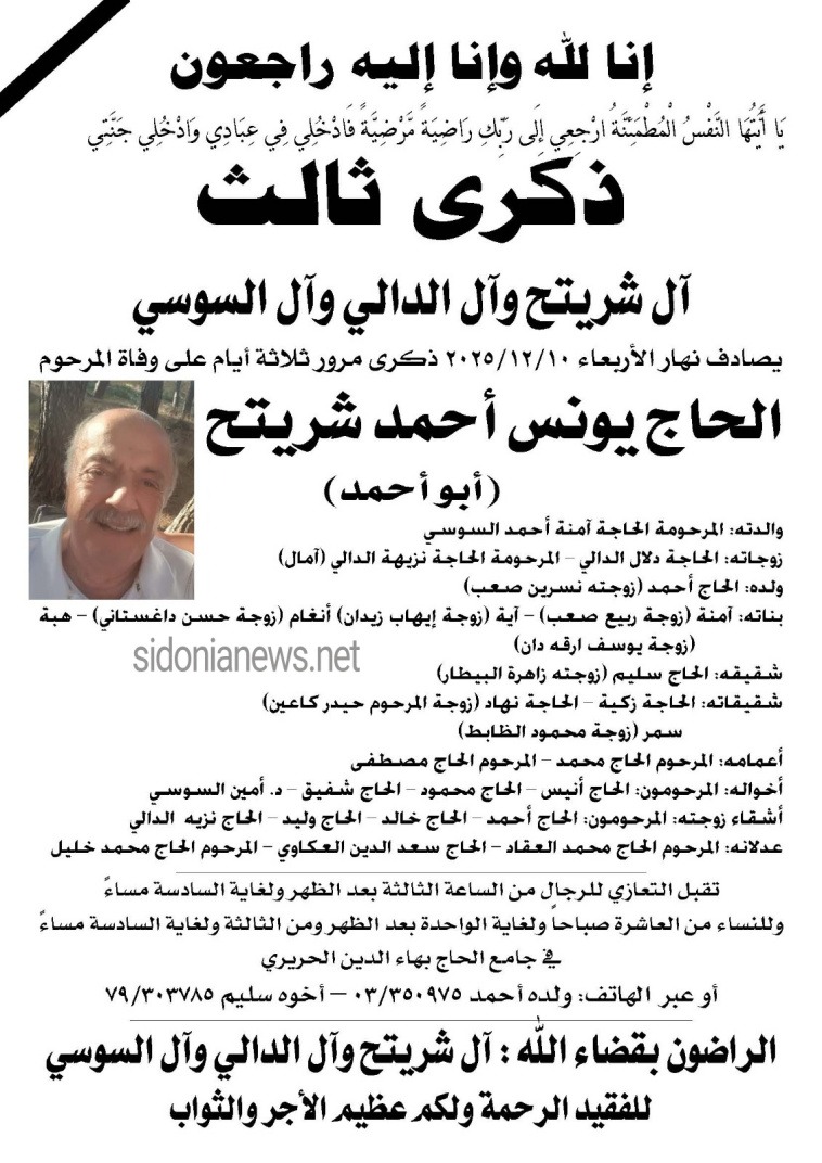 وفاة الحاج يونس أحمد شريتح - 8-12-2025 آل شريتح والدالي والسوسي وصعب وزيدان وداغستاني وأرقه دان والبيطار وكاعين والظابط والعقاروالعكاوي وخليل (وفيات صيدا لبنان - جريدة صيدونيانيوز.نت)