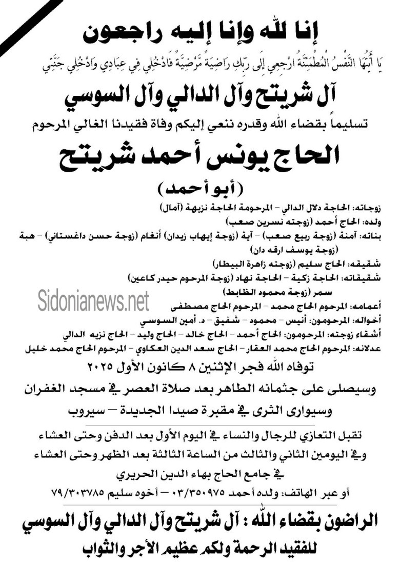 وفاة الحاج يونس أحمد شريتح - 8-12-2025 آل شريتح والدالي والسوسي وصعب وزيدان وداغستاني وأرقه دان والبيطار وكاعين والظابط والعقاروالعكاوي وخليل (وفيات صيدا لبنان - جريدة صيدونيانيوز.نت)
