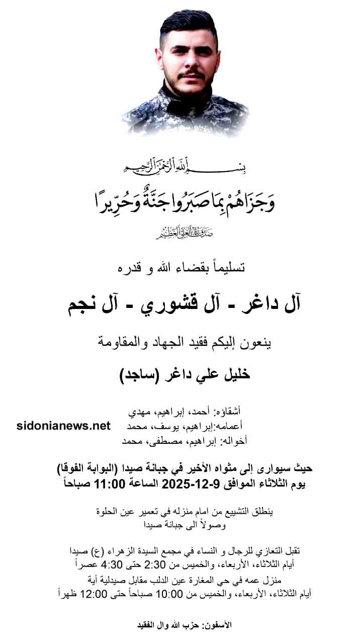 جريدة صيدونيانيوز.نت / وفاة الشاب خليل علي داغر 9-12-2025 آل داغر وقشوري ونجم (وفيات صيدا – لبنان – جريدة صيدونيانيوز.نت) 2025-12-09 Sidonianewsnet -------------------- وفاة الشاب خليل علي داغر 9-12-2025 آل داغر وقشوري ونجم (وفيات صيدا – لبنان – جريدة صيدونيانيوز.نت) 2025-12-09