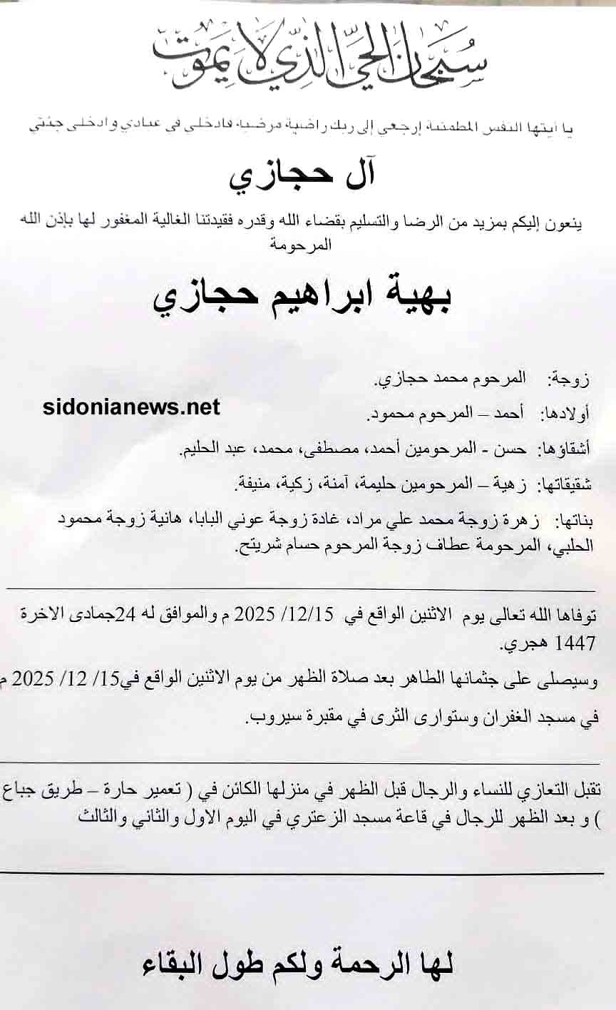 وفاة بهية إبراهيم حجازي 15-12-2025 آل حجازي ومراد والبابا والحلبي وشريتح (وفيات صيدا – لبنان – جريدة صيدونيانيوز.نت)