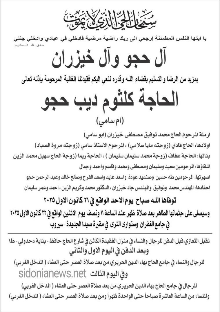 وفاة الحاجة كلثوم ديب حجو -21-12-2025-آل حجو وخيزران (وفيات صيدا لبنان -جريدة صيدونيانيوز.نت)