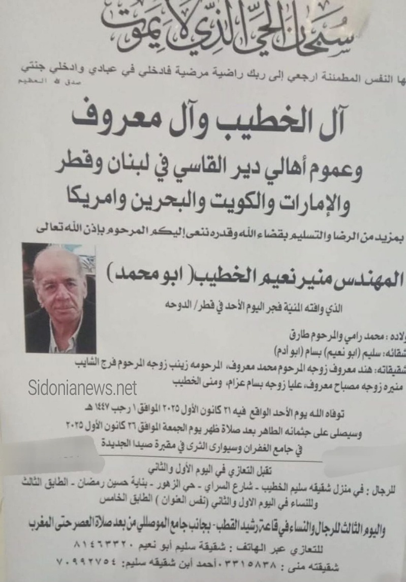 جريدة صيدونيانيوز.نت / وفاة المهندس منير نعيم الخطيب (توفاه الله في قطر - الدوحة ) - الدفن في صيدا 26-12-2025 آل الخطيب ومعروف (وفيات صيدا ودير القاسي في لبنان وقطر والإمارات والكويت والبحرين وأمريكا- جريدة صيدونيانيوز.نت)