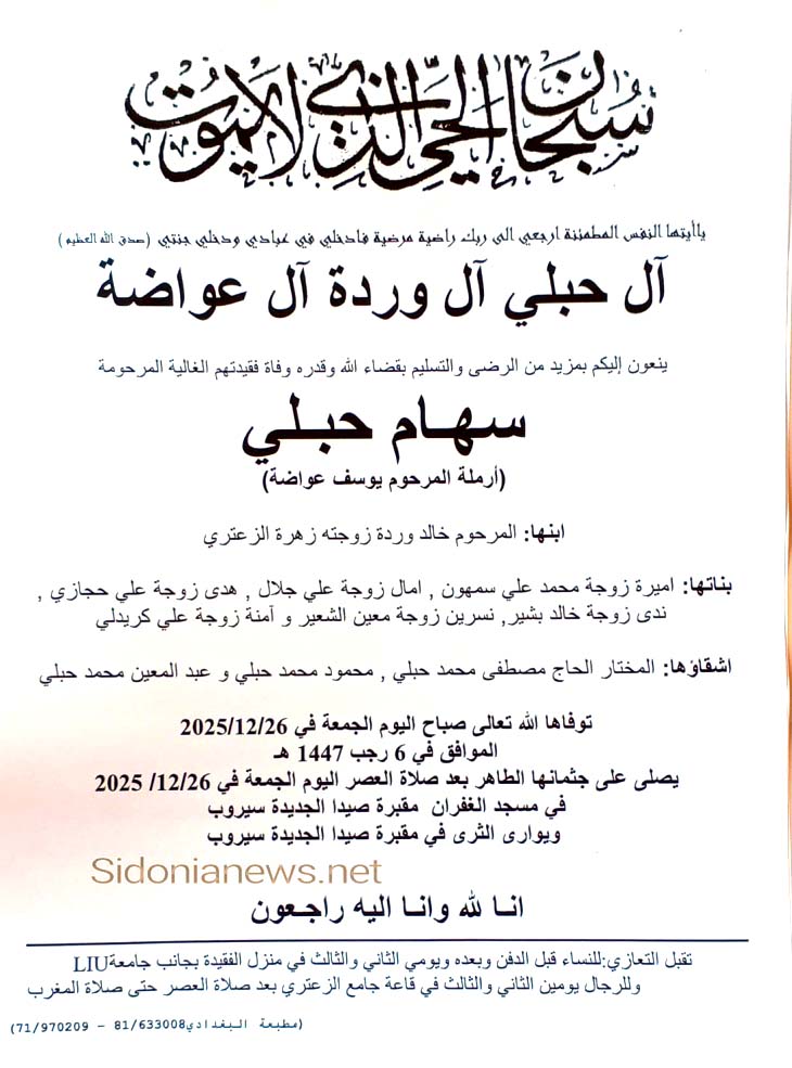 وفاة سهام حبلي 26-12-2025 آل حبلي ووردة وعواضه والزعتري وسمهون وجلال وحجازي وبشير والشعير وكريدلي (وفيات صيدا – لبنان – جريدة صيدونيانيوز.نت)