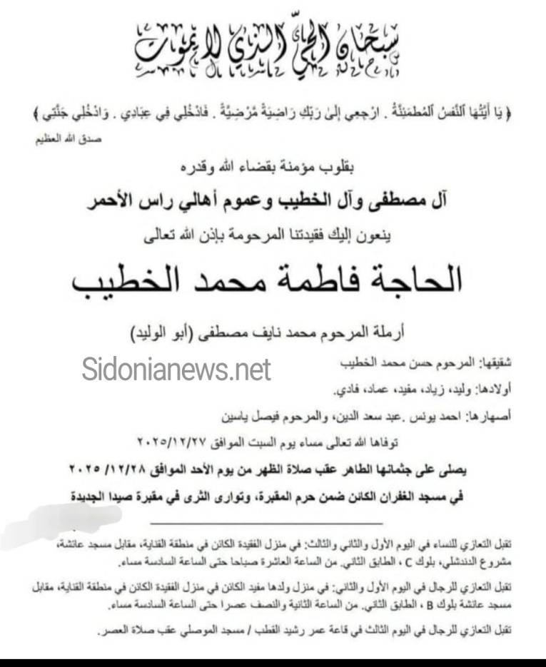 وفاة الحاجة فاطمة محمد الخطيب 28-12-2025 آل مصطفى و الخطيب(وفيات صيدا لبنان - عين الحلوة فلسطين - جريدة صيدونيانيوز.نت)