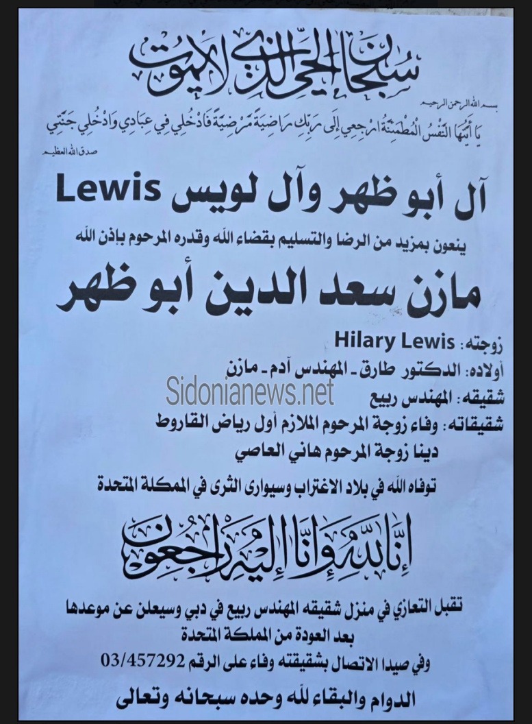 وفاة مازن سعدالدين أبوظهر في المملكة المتحدة - 3-1-2026 آل ابوظهر ولويس Lewis (وفيات صيدا لبنان - جريدة صيدونيانيوز.نت)