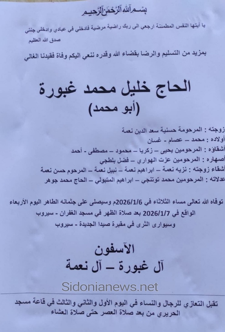 وفاة الحاج خليل محمد غبورة -7-1-2026-آل غبورة ونعمة والهواري وبلطجي وتوتنجي والمتبولي وجوهر (وفيات صيدا لبنان -چریدة صيدونيانيوز.نت)