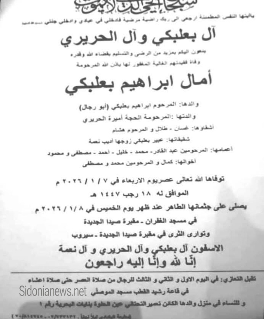 وفاة آمال إبراهيم بعلبكي - الدفن الخميس 8-1-2026 - آل بعلبكي والحريري ونعمة (وفيات صيدا لبنان - جريدة صيدونيانيوز.نت )