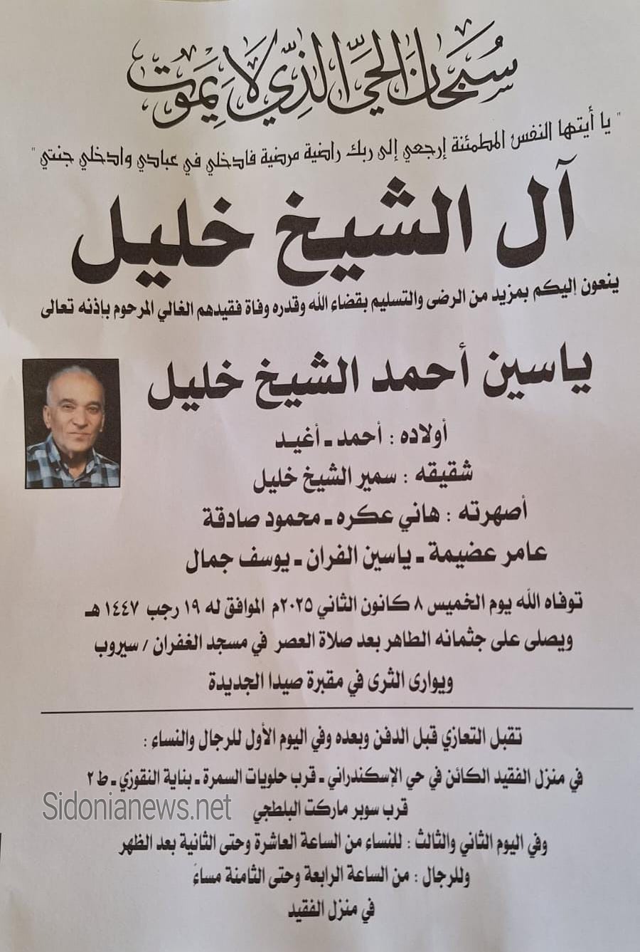 وفاة ياسين أحمد الشيخ خليل - 8-1-2026 آل الشيخ خليل وعكرة وصادقه وعضيمه والفران وجمال (وفيات صيدا - لبنان - جريدة صيدونيانيوز.نت)