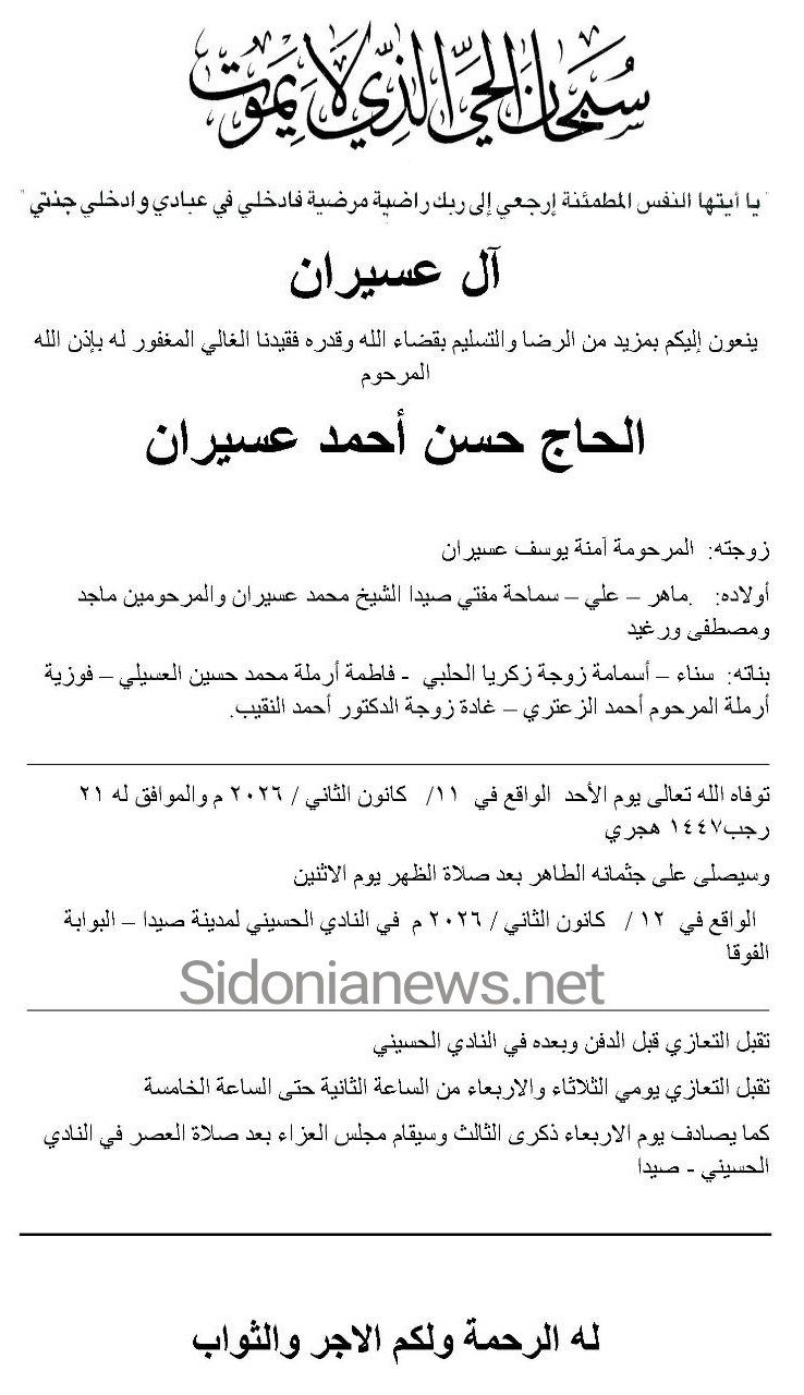 جريدة صيدونيانيوز.نت / وفاة الحاج حسن أحمد عسيران-والد سماحة مفتي صيدا الجعفري الشيخ محمد عسيران -١١-١-٢٠٢٦ -آل عسيران (وفيات صيدا لبنان -جريدة صيدونيانيوز.نت)آل عسيران
