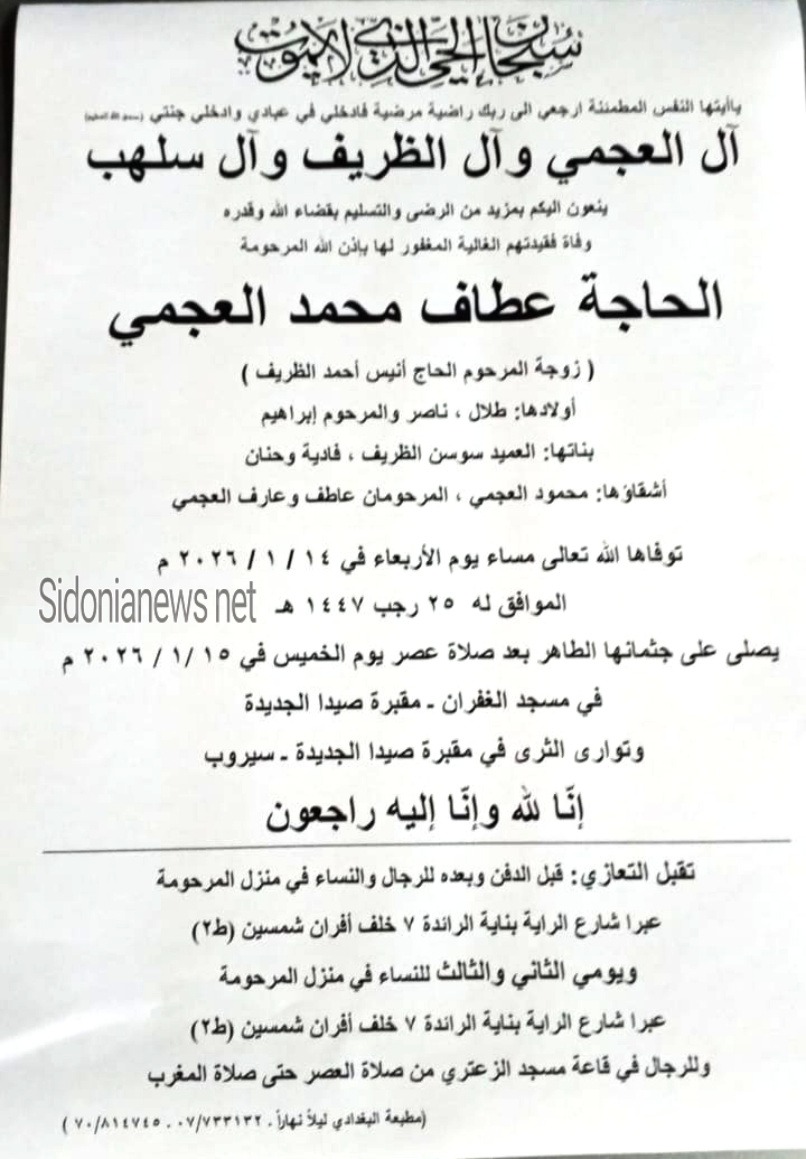 جريدة صيدونيانيوز.نت / وفاة الحاجة عطاف محمد العجمي -15-1-2026آل العجمي والظريف وسلهب (وفيات صيدا لبنان -جريدة ضيدونيانسوز.نت)