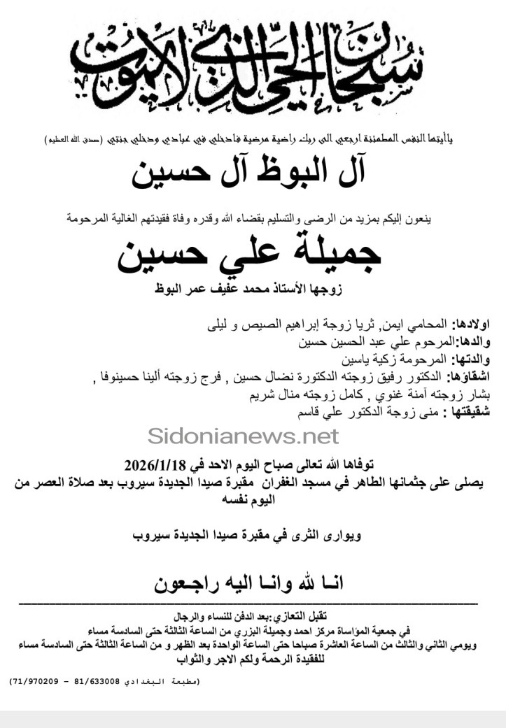 جريدة صيدونيانيوز.نت / وفاة جميلة علي حسين -18-1-2026- آل البوظ وحسين (وفيات صيدا لبنان -جريدة صيدوميانيوز.نت)