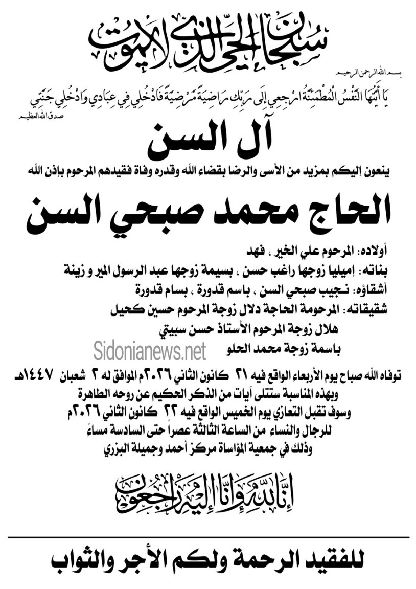 وفاة الحاج محمد صبحي السن - 21-1-2026 - آل السن(وفيات صيدا لبنان -جريدة صيدونيانيوز.نت)