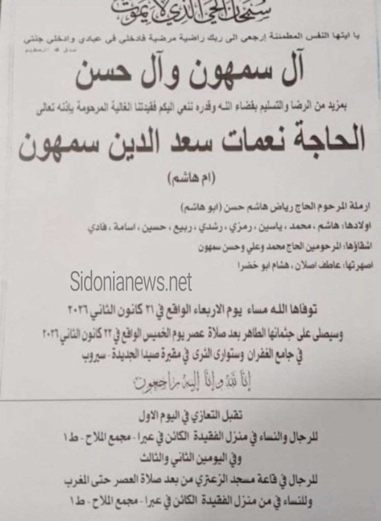 وفاة الحاجة نعمات سعد الدين سمهون 22-1-2026 آل سمهون وحسن واصلان وأبو خضرا (وفيات صيدا – لبنان – جريدة صيدونيانيوز.نت)