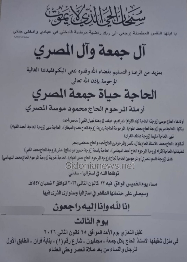 وفاة الحاجة حياة جمعة المصری-٢٣-۱-۲۰۲٦ - آل جمعة المصري (وفيات صيدا لبنان -جريدة صيدونيانيوز.نت)