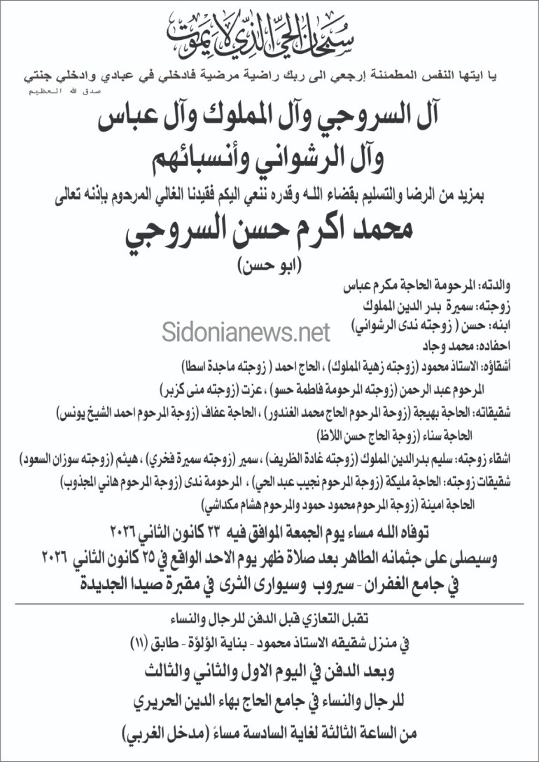 جريدة صيدونيانيوز.نت / وفاة محمد اكرم حسن السروجي ٢٤-١-٢٠٢٦