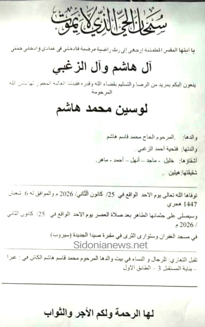 وفاة لوسين محمد هاشم - 25-1-2026-آل هاشم والزغبي (وفيات صيدا لبنان- چریدة صيدونينيوز نت)