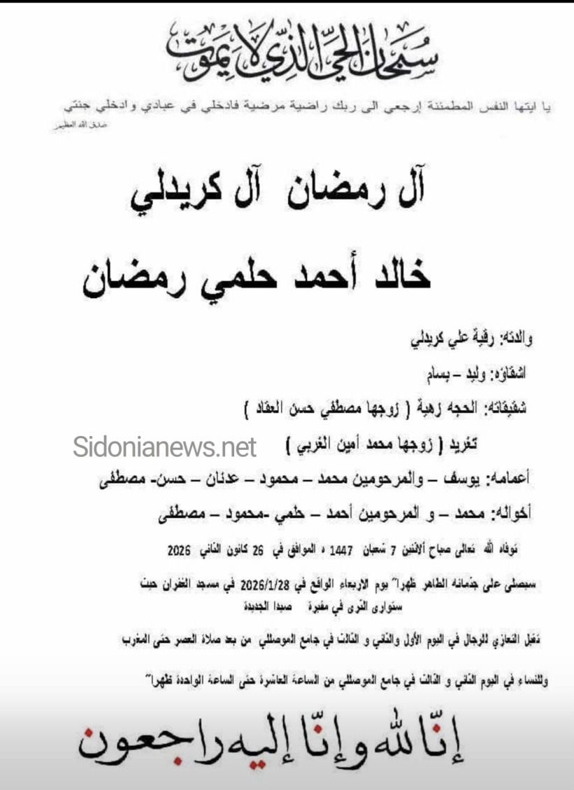 جريدة صيدونيانيوز.نت / وفاة خالد أحمد حلمي رمضان -28-1-2028 -آل رمضان وكريدلي (وفيات صيدا لبنان - جريدة ضيدونيانيوز.نت)