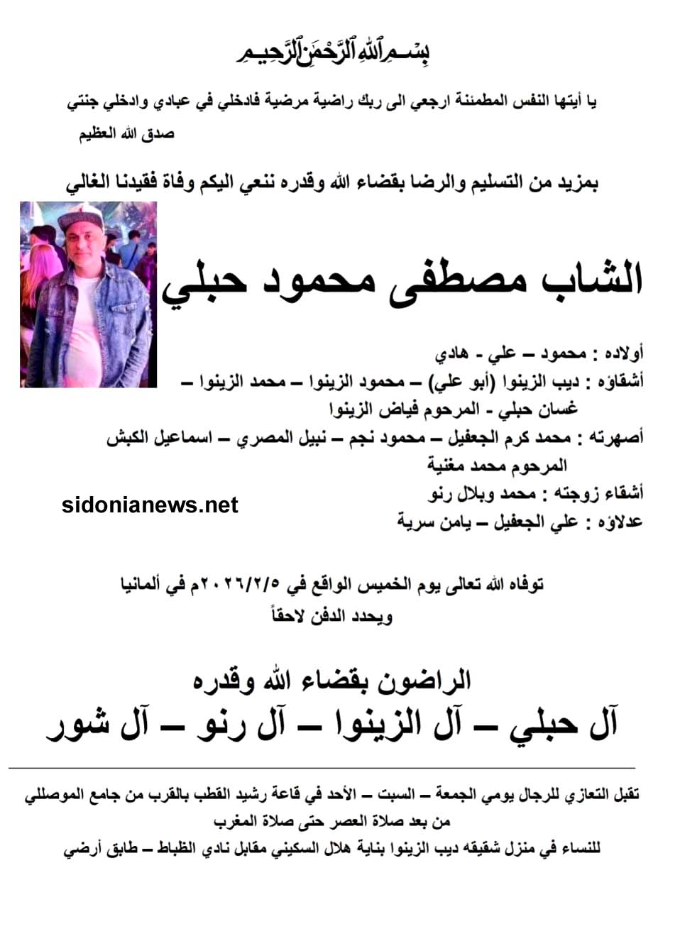 جريدة صيدونيانيوز.نت / وفاة الشاب مصطفى محمود حبلي المتوفي في ألمانيا 6-2-2026 آل حبلي والزينوا ورنو وشور والجعفيل ونجم والمصري والكبش (وفيات صيدا – لبنان – جريدة صيدونيانيوز.نت )