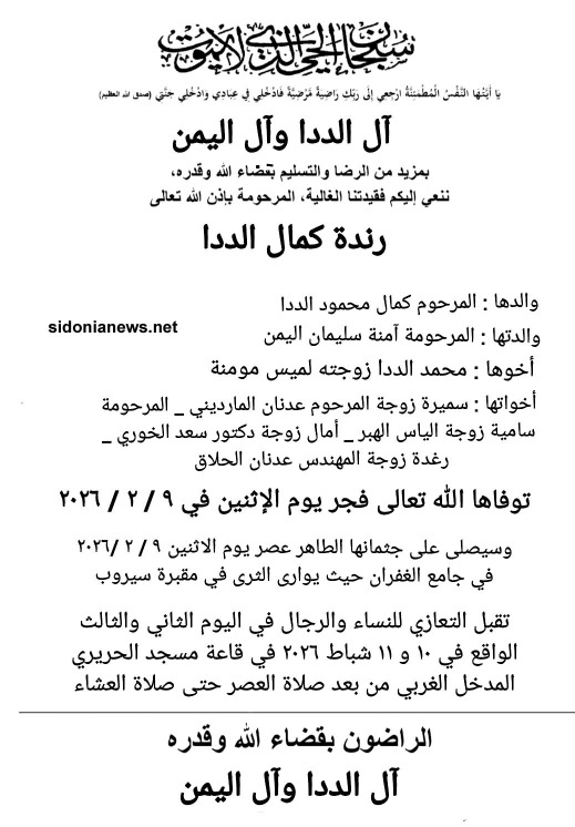 وفاة رندة كمال الددا 9-2-2026 آل الددا واليمن ومومنه والمارديني والهبر والخوري والحلاق (وفيات صيدا – لبنان – جريدة صيدونيانيوز.نت)