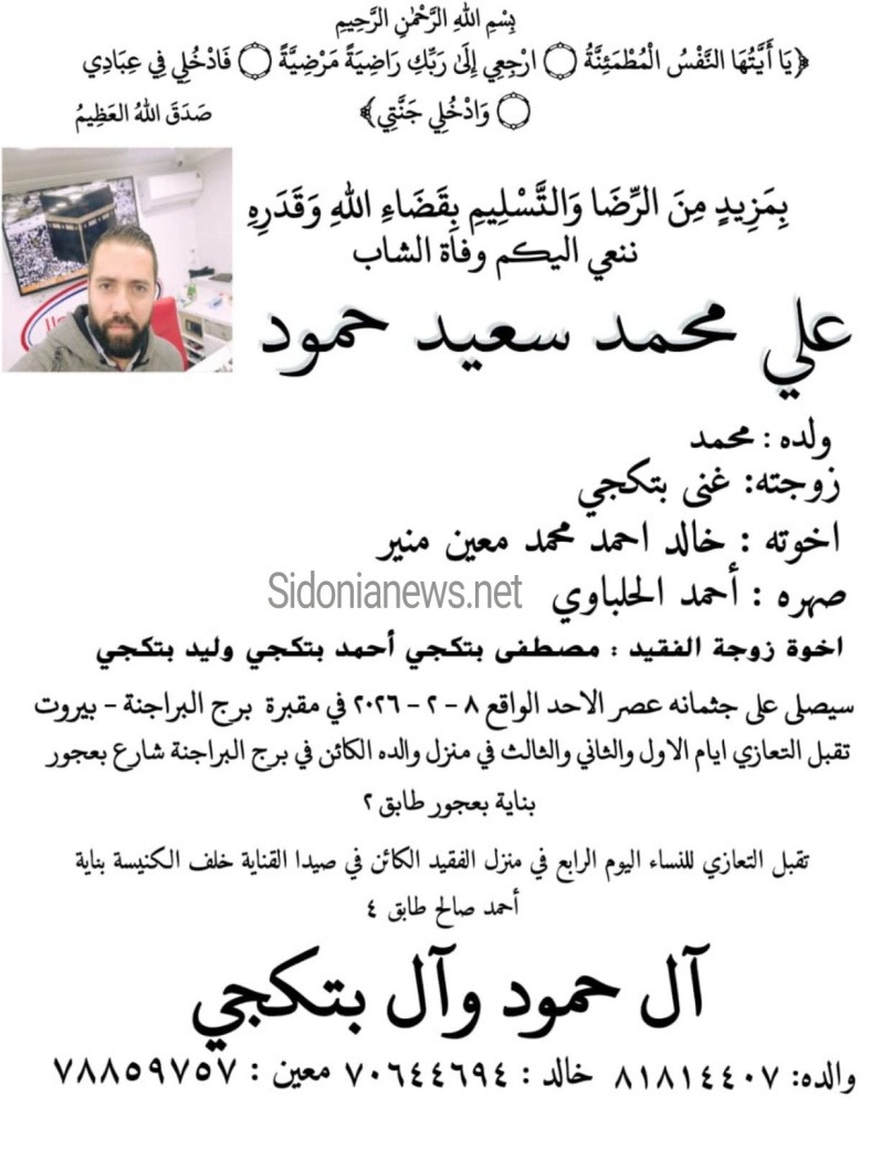 جريدة صيدونيانيوز.نت / وفاة علي محمد سعيد حمود -8-2-2026-آل حمود وبتكجي (وفيات صيدا لبنان -جريدة صيدونيانيوز.نت)