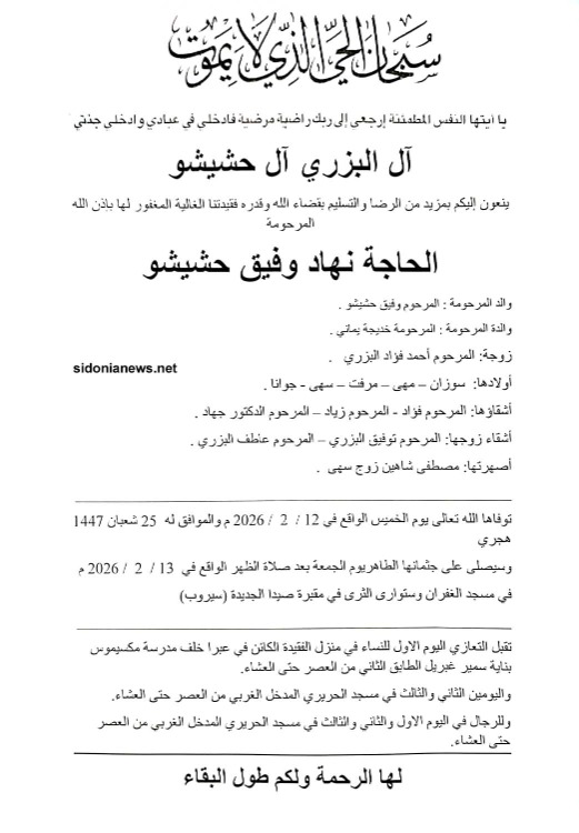 وفاة الحاجة نهاد وفيق حشيشو 13-2-2026 آل حشيشو والبزري ويماني وشاهين (وفيات صيدا – لبنان – جريدة صيدونيانيوز.نت)