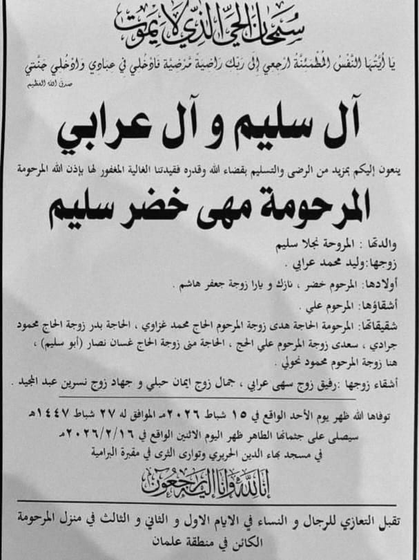 الرئيسية / الوفيات / وفاة مهى خضر سليم - الدفن 16-2-2026 آل سليم وعرابي (وفيات صيدا لبنان - جريدة صيدونيانيوز.نت)