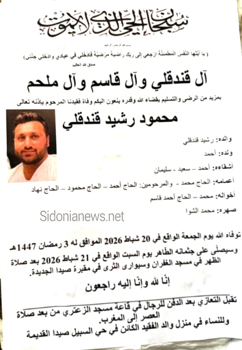 وفاة الشاب محمود رشيد قندقلي - الدفن 21-2-2026 آل قندقلي وقاسم وملحم (وفيات صيدا لبنان - جريدة صيدونيانيوز.نت)