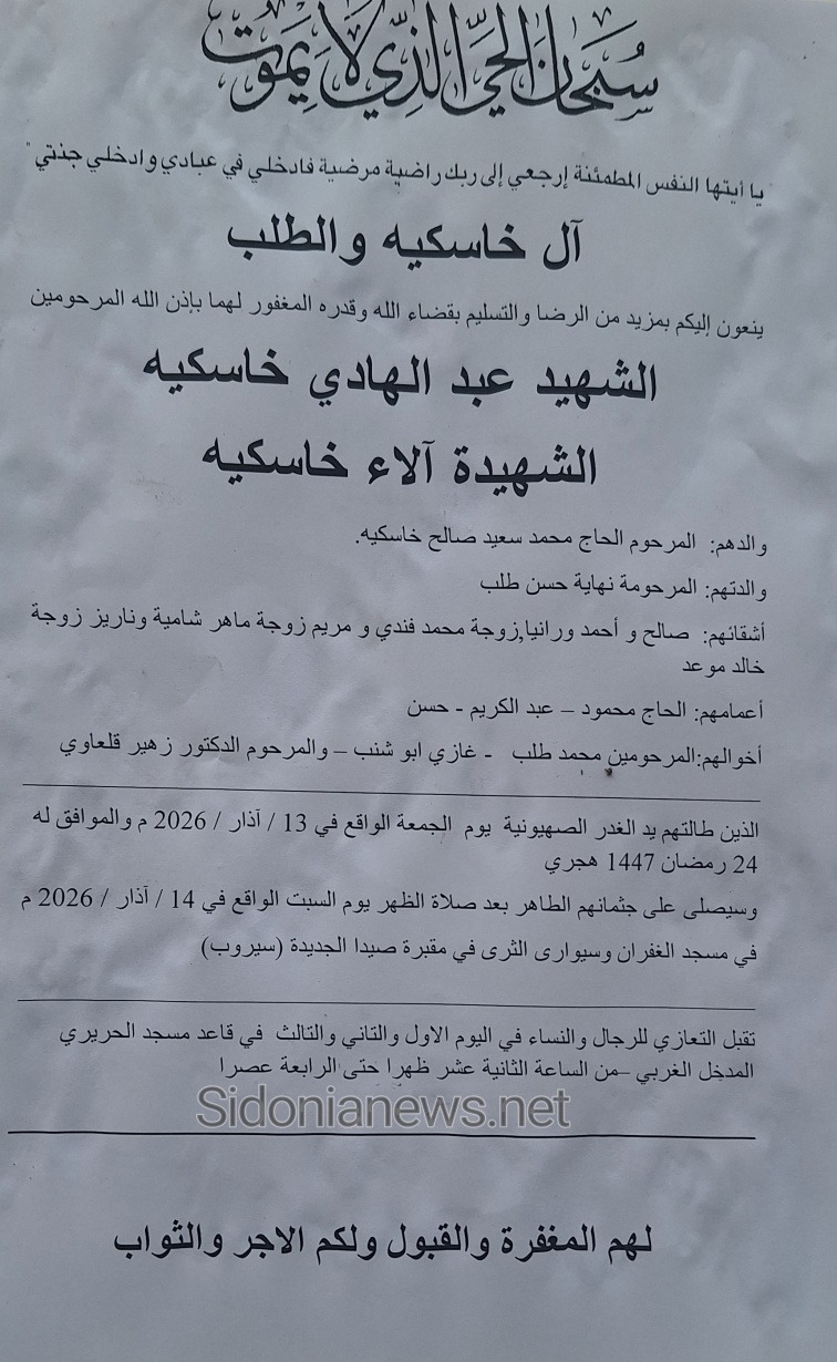 الشهيد عبدالهادي خاسكية والشهيدة آلاء خاسكية - الدفن 14-2-2026 -آل خاسكية والطلب (وفيات صيدا لبنان -جريدة صيدونيانيوز.نت)