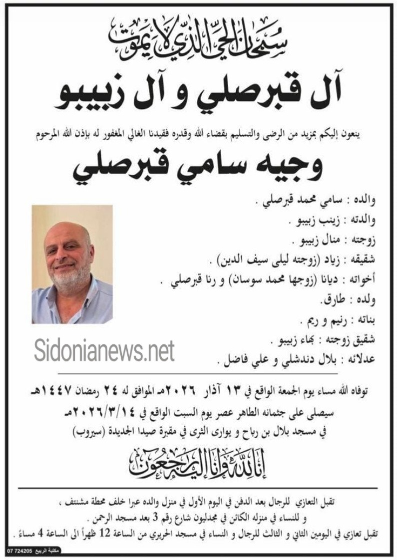 جريدة صيدونيانيوز.نت / وفاة وجيه سامي قبرصلي - الدفن 14-3-2026 آل قبرصلي وزبيبو وسيف الدين وسوسان ودندشلي وفاضل (وفيات صيدا لبنان - جريدة صيدونيانيوز.نت)