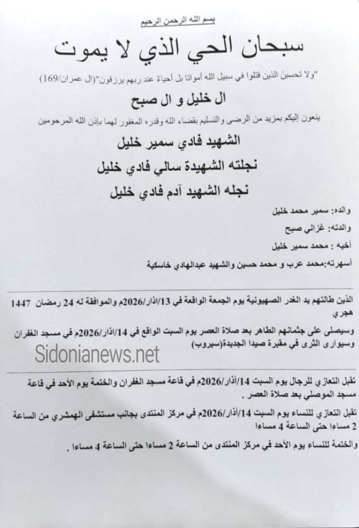 جريدة صيدونيانيوز.نت / تشييع الشهداء الوالد فادي سمير خليل وإبنته سالي وإبنه آدم(ضحايا الغارة الإسرائيلية على المبنى السكني في الفوار نهار الجمعة ) - الدفن 14-3-2026 آل خليل وصبح (وفيات صيدا لبنان - جريدة صيدونيانيوز.نت)